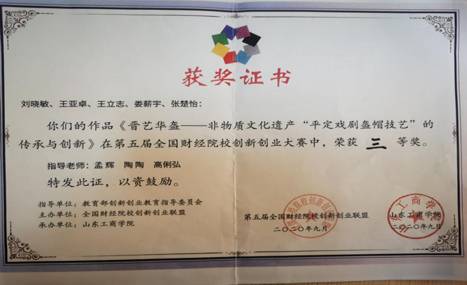 2020年,学院学生刘晓敏团队项目《晋艺华盔——非物质文化遗产“平定戏剧盔帽技艺”的传承与创新》