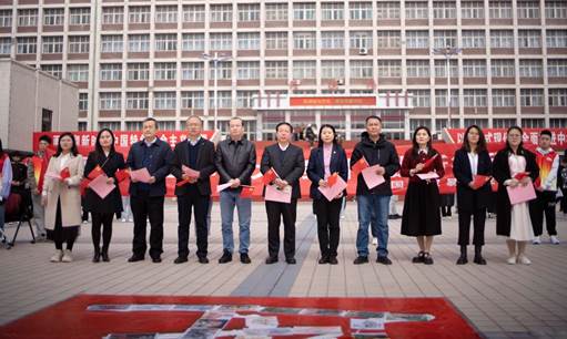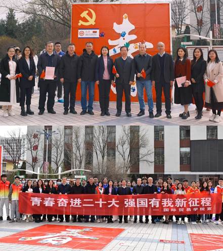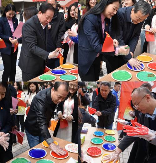 党委引领青年花式学习党的二十大精神的活动现场,观者如市,如火如荼。中午12:00,校党委副书记张永德,宣传部、学生工作部、保卫部、文化旅游与新闻艺术学院、法学院等部门负责人与青年一道在“青”字上拓印留念,题词签名,掀开了“青春奋进二十大”主题活动的序幕,邂逅中国红,同心颂党恩。