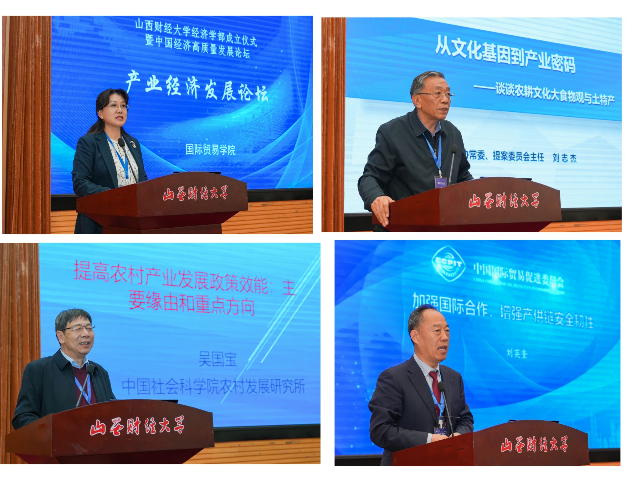 院长郭建宇教授主持。山西省政协提案委刘志杰主任以《从文化基因到产业密码》为题,聚焦农耕文化在乡村振兴中的现代价值与发展路径,深刻阐释了“农耕文化不能丢,要不断发扬光大”的核心内涵,以及“树立大农业观、大食物观”的战略意义,为山西农业现代化与乡村产业振兴提供了理论支撑与实践指导。中国社会科学院农村发展所吴国宝研究员作了《提高农村产业发展政策效能》的报告,系统剖析当前涉农政策执行中的突出问题并明确优化方向,指出农村产业发展政策作为“三农”政策的重中之重,效能提升至关重要。当前政策效能不佳主要体现在政策逻辑错配、实践执行不足、效果偏离预期三方面,对此他提出确定合理目标、强化政策协同、健全投入体系、改善分配效应、提升执行能力五大重点改进方向。中国国际贸易促进委员会研究院刘英奎研究员以《加强国际合作 增强产供链安全韧性》为题,深入分析全球产业链供应链重构压力,提出通过深化国际合作构建自主可控、安全可靠的产供链体系,为维护国家经济安全、推动高质量发展筑牢保障。